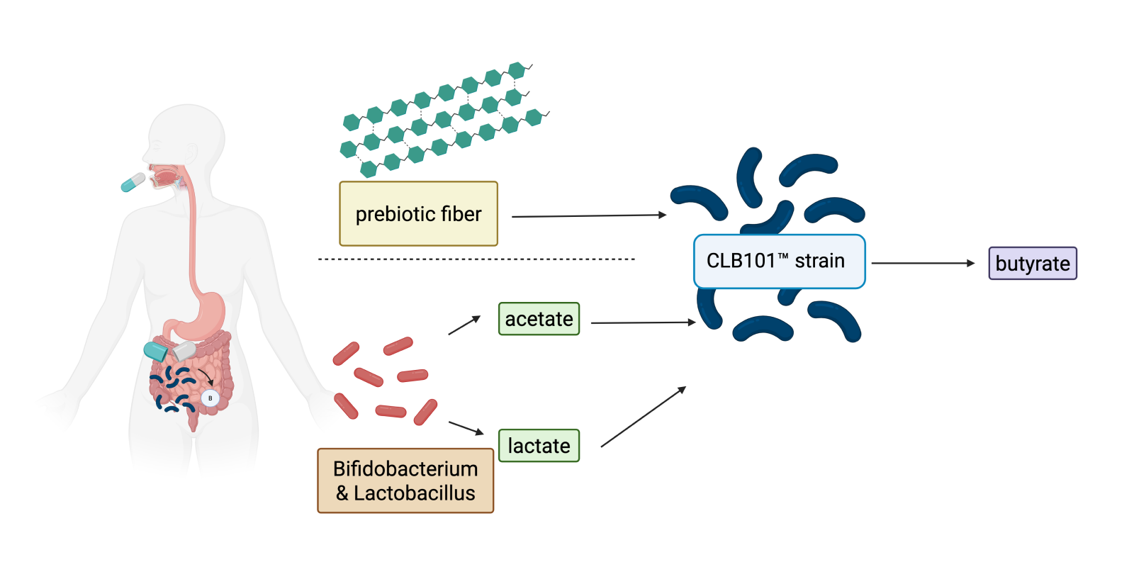 CLB101™ resides in the lower gut, where it was discovered to provide a natural and continuous source of butyrate.* The CLB101™ strain is very unique in that it can produce butyrate in two ways: